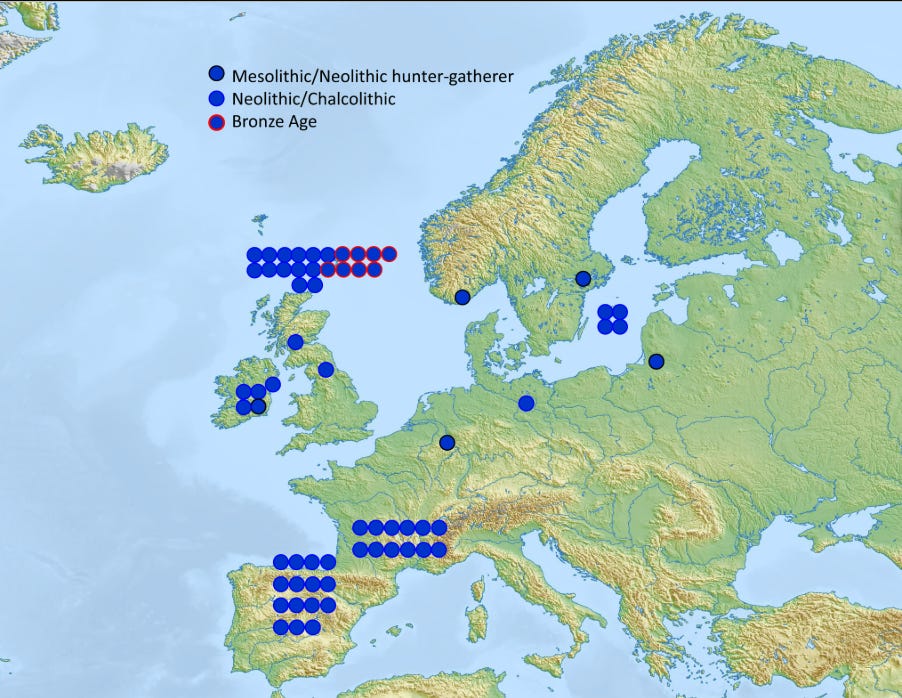 Distribution of prehistoric I2a1b-M423 Y-chromosome lineages in Europe. Each circle represents one individual carrying I2a1b. https://www.pnas.org/doi/10.1073/pnas.2108001119