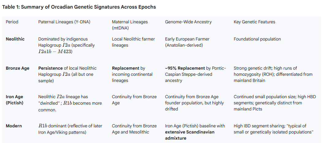 These two lines of evidence are not separate; they are cause and effect. The “period of isolation and endogamy” proposed by the PNAS study is the “small ancestral population size” and “strong genetic drift” detected by the PMC study. Therefore, the unique, sex-biased admixture event that occurred in the Early Bronze Age created a profound population bottleneck. This bottleneck marks the originating event of the long-term genetic insularity that would become the defining characteristic of Orkney’s genetic history for the next 4,000 years.