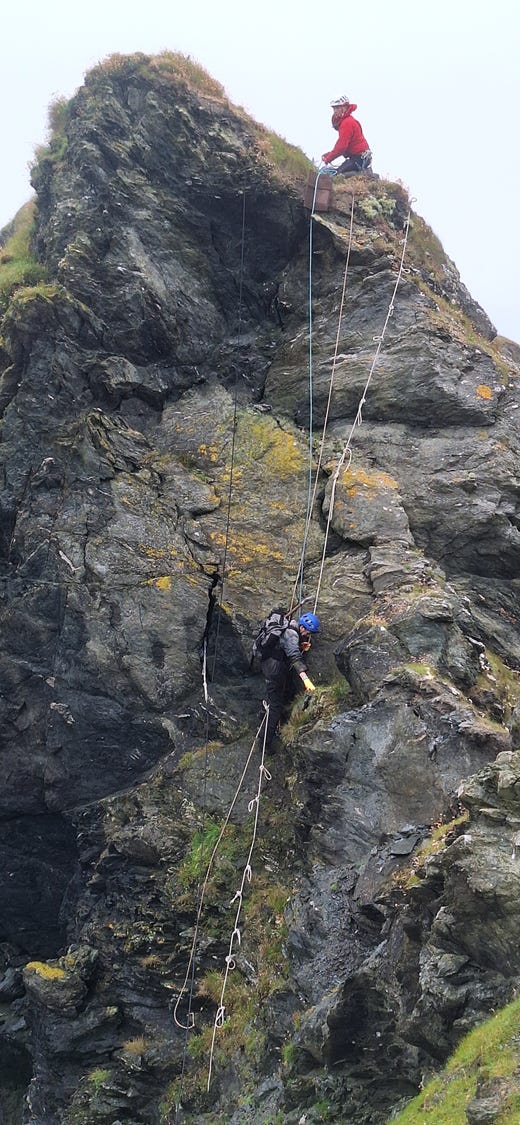 The 2024 season made the situation still clearer. The access ridge had degraded substantially since 2003. Where Hirst’s team in 2003 had a level walk to the foot of the first ascent, we had to descend 2-3m before beginning to climb. Fresh erosion scars were prominent near the most difficult section. The seaward bank or rampart had been removed entirely at the location where we had proposed Trench 5. The landward rampart section is now perched on overhanging bedrock—it cannot always have been in that position—indicating active undercutting from below. Extensive burrowing is now present across the landward rampart. The northern stretches of the rampart have been lost entirely, and the exposed sections show little stone component, suggesting this may always have been primarily an earthen bank.