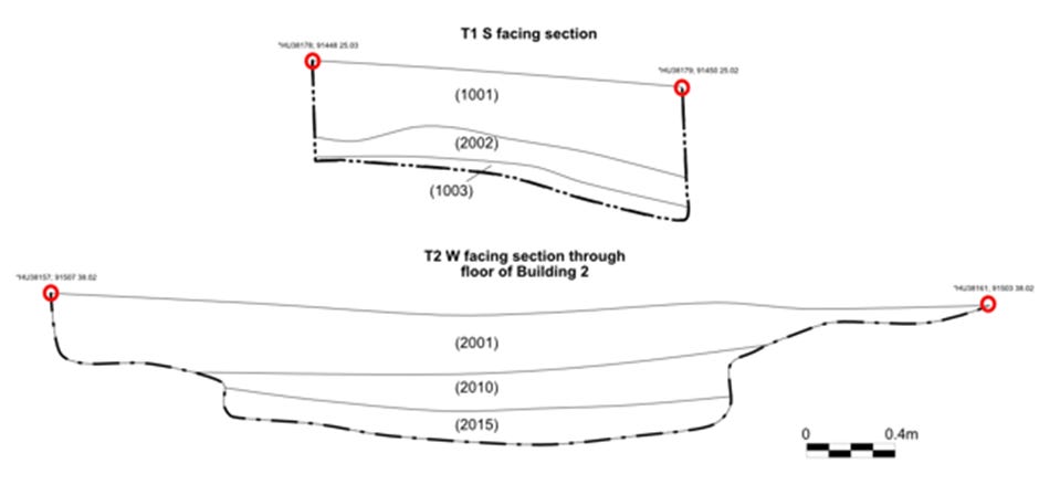 Sections through Trench 1 and floor 2015 in Trench 2.