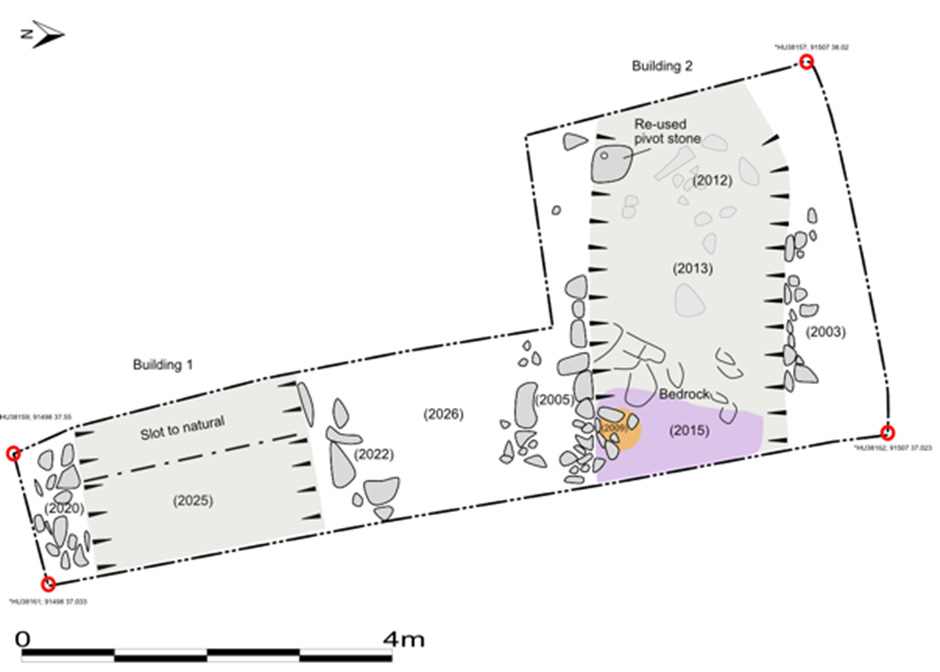 Trench 2 was the productive heart of the season. L-shaped in plan, it measured approximately 1.8 x 5.5 m across Building 1 and around 3 x 4 m across Building 2, with a passageway (context 2026) of approximately 0.8m between the two structures.