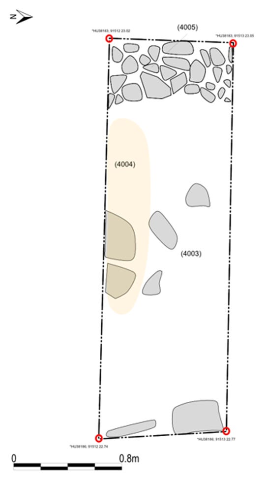 A wall (4005) was identified on the western side, around 0.3m wide and 0.1m high, in two main courses of local stone. Below the stone collapse (4002) inside was a floor or foundation deposit (4003) of occasional flat slabs in a matrix of gravel and yellow-brown clayey silt. A small charcoal concentration (4004, c.0.02m thick) was identified on the floor surface towards the upslope side, and a bulk sample (S402) was collected for dating. Like the other buildings, the interior showed remarkably little accumulated deposit.